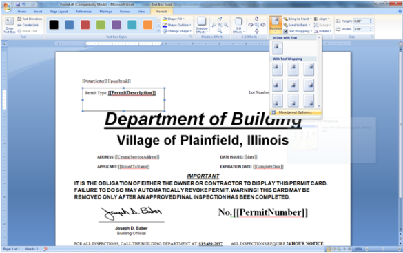 When inserting your text fields into the applicable template insert them into a text box as shown below. It will be easier to control the format of the document if you can keep the applicable data fields where they are placed on the form: