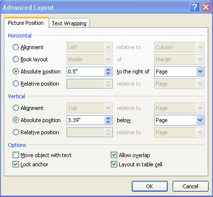 Once the Advanced Layout text box appears you will see two tabs. In the first you will define where your text box will stay in relation to the page. If you want your text box to stay exactly where it is on the page(as is the case typically when you create a LICENSE RENEWAL) then in the Horizontal section select “Page” in the right hand drop down menu. Do the same in the vertical “below” drop down menu: