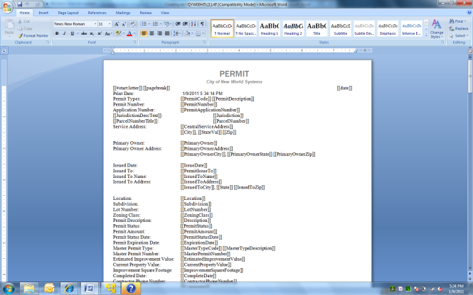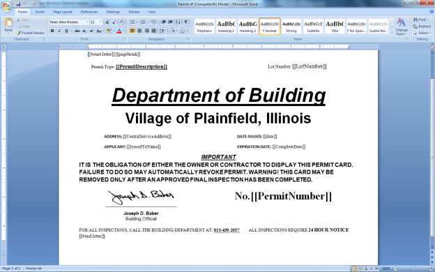 Once you have copied all the text fields into your document you are then ready to save your file. Once again all of your mail merge documents in permitting and code enforcement must be saved in the RTF format mentioned above.