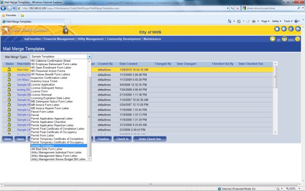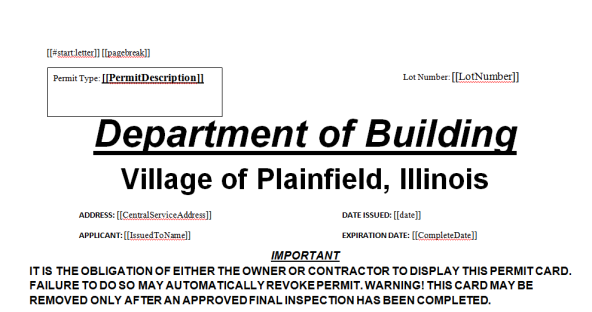 Download the applicable sample template from Logos. Your options for Permitting and Code Enforcement will be a “permit form letter”, “permit”, “permit application approval letter”, “permit application denial letter”, “Certificate of occupancy”, temporary certificate of occupancy”, “inspection confirmation letter”(this is used for any type of inspection”, or “case form letter”(this is used strictly for code cases). All are Rich Text Format (RTF) forms. Follow the path below in Logos to download your sample templates.