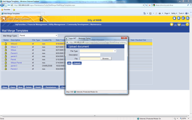 Chose the File Type (for permits and code enforcement this will always be RTF), Description (this is the name you want the form to be known as in the system), and choose the file from your hard drive. Click ok to add your form to the list that you already see.