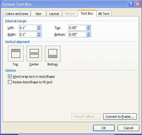Click on the “text box” tab. On this tab you will choose whether or not you want your text box to expand horizontally or vertically once it fills with data. If you want it to expand horizontally uncheck the “word wrap text AutoShape” option and check the “resize AutoShape to fit text” option: