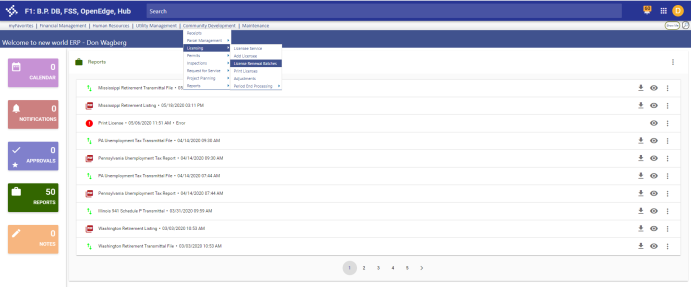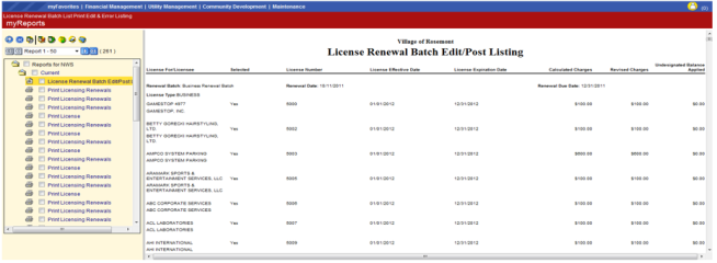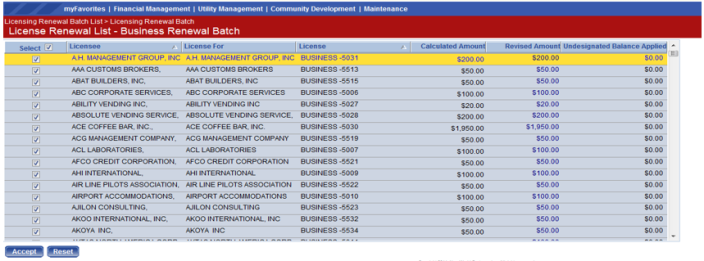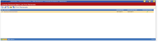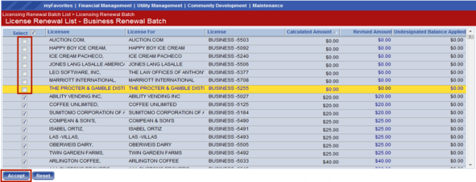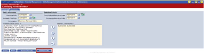 Fill in all of the yellow fields. Renewal Date (not Renewal Due Date) should be TODAY’S date. The other date fields should read 12/31/20xx, if all licenses expire at years end. For monthly renewals, the renewal due date should be the last day of the renewal month (ie 6/30/20xx, for June renewals) The FROM expiration date should be the 1st of the given month, the TO expiration date should be the last day of the given month. You can double-click on the license type to move it to the right, or you can highlight and hit the single arrow key to complete the transfer. In this example, we are creating a Business License Renewal Batch. When ready, click on Build Results.