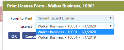 Select Reprint Issued License under Form to Print. Then select the appropriate license year from the License drop-down. Click OK when finished.
