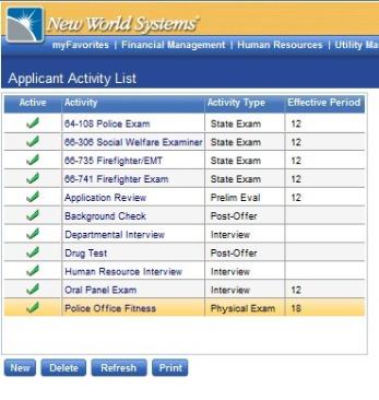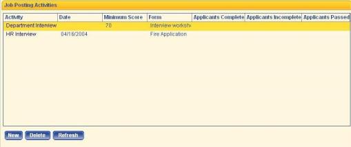 During the hiring process, applicants may be required to perform a number of activities. These activities include items such as exams, interviews, and physical tests. This section allows the users to define the activities that will be used. Activities are then associated to positions and job postings. This lets users know what activities an applicant needs to perform for a specific job posting.