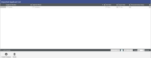 New world ERP will communicate with the third-party system, and if it finds and hired applicants, it will import them to new world ERP. After the data has been imported, the Imported Applicant List page will open, containing a grid of the applicants who have been imported.
