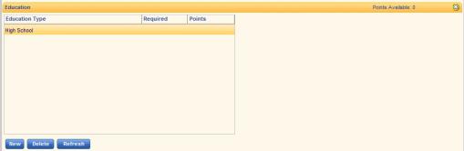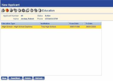 The Education qualifications section allows users to view and maintain the education the applicant has completed. The Education title bar is shown in the screen above.
