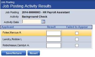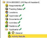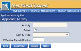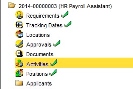 Applicant Tracking Activity allows organizations to define and maintain the various activities that occur during the application process. Through the Applicant Tracking Activity function, the user also has the ability to associate various activities with specific job postings.