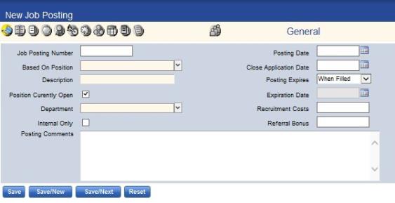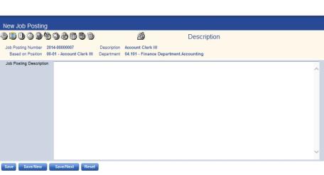 - Job Posting Number - This control is required. It contains the code that will uniquely identify this job posting. A year-based number will be supplied automatically. This control may contain 13 characters. It is disabled in EDIT mode.