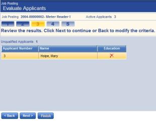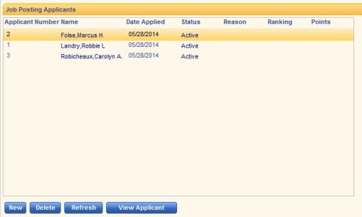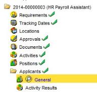 When the user clicks on an applicant at the highest level rather than on one of the applicant’s attributes, the general applicant information will display. This is a summary of the information entered on the first page of the New Job Posting process.
