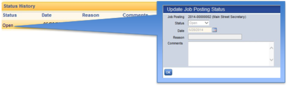 The Job Posting title bar allows users to view the postings this applicant is associated with. The applicant’s status for each posting is also displayed, as well as an explanation for any status changes.