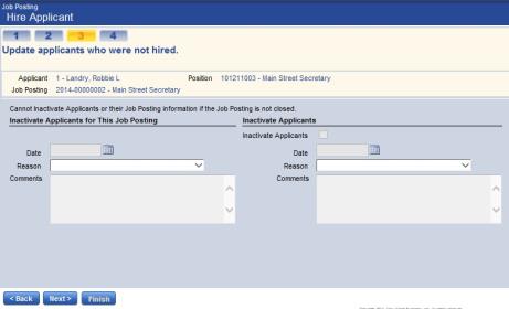 Mass Inactivate Applicants allows authorized users to inactivate multiple applicants at once. This feature is useful for organizations who inactivate applicants after a set period of time or once a posting has been filled. It streamlines the task of keeping the system data at a reasonable amount.