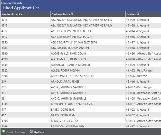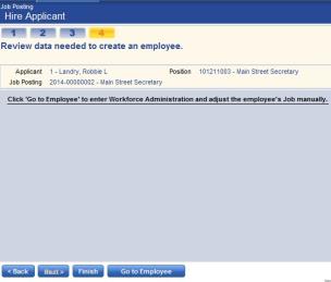 Highlight the applicant you want to add into Workforce and click Create Employee for the new hire pop up to appear prepopulated. Click OK and continue to enter in any additional fields in Workforce.
