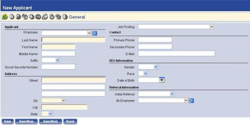 The Applicants page, accessed from the Human Resources menu (Human Resources > Applicant Tracking > Applicant), allows authorized users to view and maintain details related to applicants.