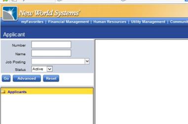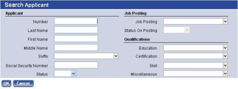 The Search Applicant pop-up page, accessed by clicking the Advanced button on the Applicants page, allows authorized users to perform an advanced search that utilizes additional controls to those on the Applicants page.