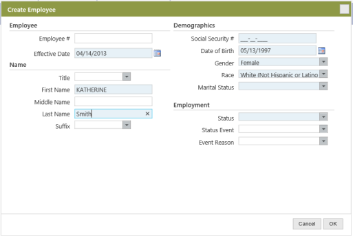 Make any entries necessary in this dialog, and click OK. The Workforce page will open, and you may continue with the process of creating the employee's record.