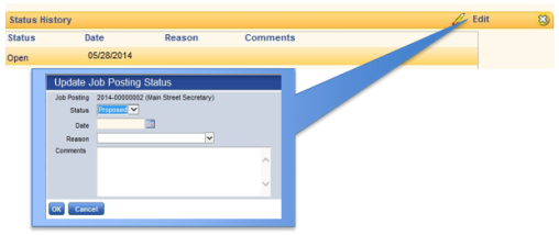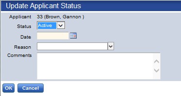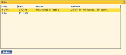The Update Applicant Status pop-up page, accessed by clicking the Edit icon on the Status History title bar, allows authorized users to update the status of the entire applicant record. The status might change due to an applicant’s finding a different job, getting reactivated when she or he applies for a new position, or getting turned down for one of the positions for which she or he was being considered.