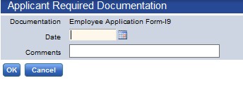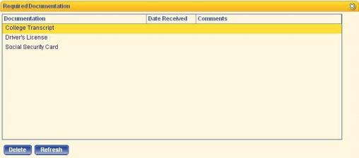 The Applicant Required Documentation pop-up page, accessed by clicking a Documentation hyperlink on the Job Posting title bar Required Documentation attribute of the Applicants page, allows authorized users to record the receipt of documentation (e.g., driver’s license, school transcripts) that the applicant is required to provide to remain under active consideration for a posting.