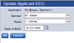 The Update Applicant EEO pop-up page, accessed by clicking the Edit icon on the EEO Information title bar on the Applicants page, allows authorized users to enter and update EEO information.