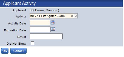The Applicant Activity pop-up page, accessed by clicking the New button or an Activity hyperlink on the Activity attribute of the Applicants page, allows authorized users to add and maintain applicant activities. This page can initially be used for scheduling purposes and later for recording results.