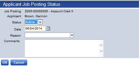The Applicant Job Posting Status pop-up page, accessed by clicking the Update button on the Status title bar Job Postings attribute or a Status hyperlink on the Job Posting title bar Job Posting attribute of the Applicants page, allows authorized users to update the status of an applicant on a job posting. This status is specific to the job posting and does not affect the applicant’s overall status.