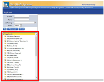 The Results section is located on the left side of the page under the Search section. When a search is performed, the Results section displays the applicants that match the search criteria and to which the user has authority.