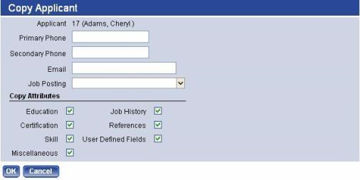The Copy Applicant pop-up page, accessed by clicking the Copy command button on the Applicant Information title bar of the Applicants page, allows authorized users to create a new applicant record based on a prior applicant record. It is useful if the organization makes a practice of having one applicant record per job posting or if the applicant applies for a position after a prior applicant record has expired.