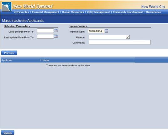 The Mass Inactivate Applicants page, accessed from the Human Resources menu (Human Resources > Applicant Tracking > Mass Inactivate Applicants), allows authorized users to inactivate multiple applicants in the system.