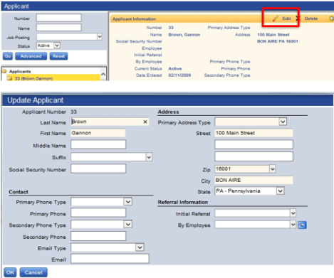 The Update Applicant pop-up page, accessed by clicking an Edit icon on the Applicants page, allows authorized users to modify the applicant data.