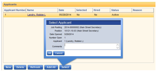 To create an employee record for an applicant, select the check box next to the appropriate Applicant Number, and click Create Employee. To delete someone who already is in the system as an employee, click Delete. If documents, such as a resume, certificate, letter of reference, are attached to the applicant, a Select Documents dialog will open. Select the documents to be imported with the rest of the applicant's data.