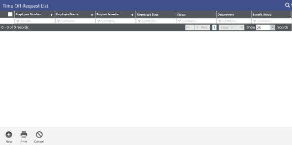 All time off requests are contained in a grid, with each row corresponding to a request. Requests are sorted by employee name, followed by employee number and request number. You may sort or filter the grid by any column.