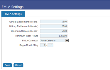 Use the FMLA Settings page to define employee FMLA entitlement and eligibility rules per federal law.