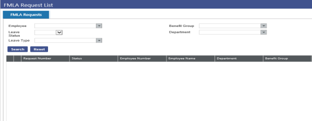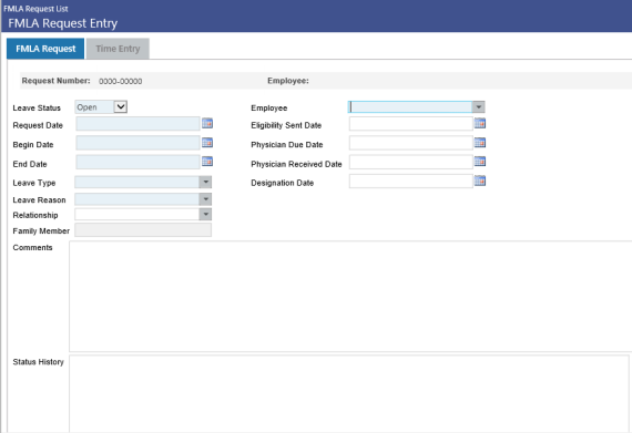 Use the FMLA Request tab to record the name of the employee requesting leave, the leave status and type, leave reason, request date, leave duration, key notifications and dates and other data pertaining to the request.