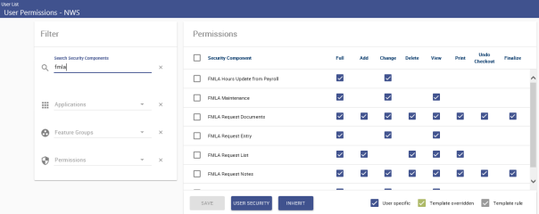 - Click Permissions. The Permissions page for the selected user will open, showing a grid of application security components.