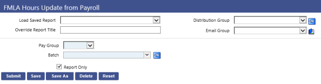 Pay group and batch having FMLA hours updated from payroll. Only posted pay batches are available for selection. |