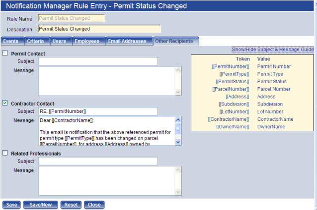Use the Other Recipients tab to customize automated emails that are sent to those who should be notified by email when a Permit event occurs. Optionally, you can also select data fields (Tokens) to include in the email that populate the email with permit values that are in the system; for example, you can create an email that goes to the Permit Contact that always contains the Permit Number and Permit Type without your having to type that information each time the message is generated.