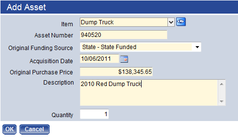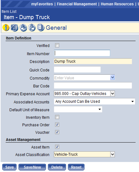 Primary Expense Account – Fill in the expense account to be used with the item. This is typically a capital outlay account within the organization set the user has access to.