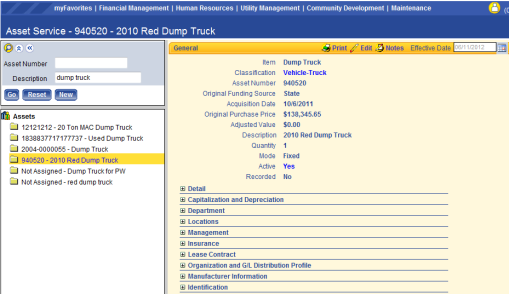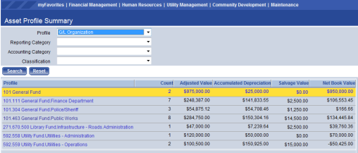 Assets by Profile – view a grid or chart based on Responsible Employee, General Location, Department, G/L Organization or Classification. Once the profile is selected, click Search and the results will display. Clicking on a profile category will take the user to Asset Service and perform an advanced search based on the selection made.