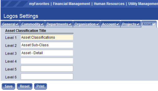 The names of the organization’s Asset Classification levels are defined in New World ERP Settings on the Asset tab.