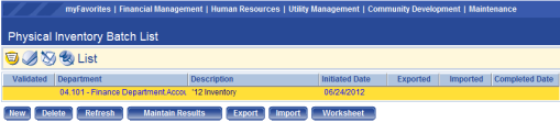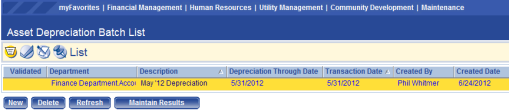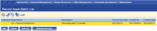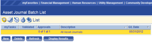 Once the batch has been created, it needs to be taken through the workflow buttons shown on the Asset Journal Batch List screen. The List icon is the first icon and it shows the status and other information related to the batch. To enter the batch and review the transactions in it, click on the description of the batch or the Display Results button.