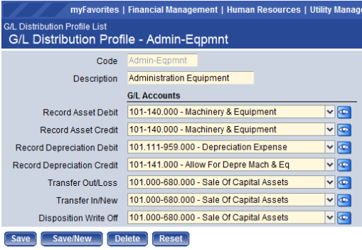 The G/L Distribution Profiles page is where G/L Accounts are defined for each type of asset, depending on how many capital asset accounts are defined in the General Ledger. These profiles will determine what accounts are used for any transaction associated to assets in the Asset Management module. When setting up an asset, an authorized user will assign the appropriate G/L Distribution Profile to the asset.