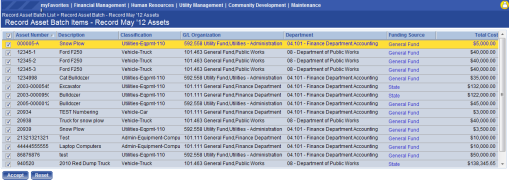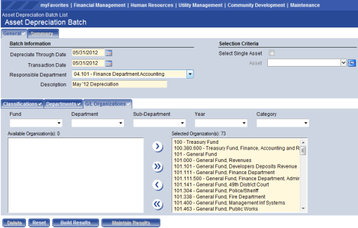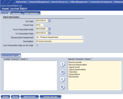Display Results – Click to view a list of all batch transaction amounts by general ledger account. This page displays the journal entry that will be created. The G/L Account is an available hyperlink to view all the asset transactions comprising the total amount for that account. Once the user views the transactions, the Asset Number becomes a hyperlink to view more information for each asset transaction.
