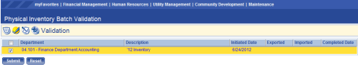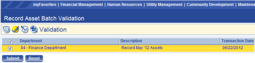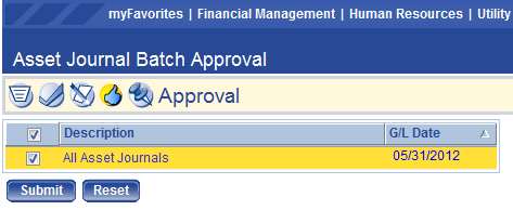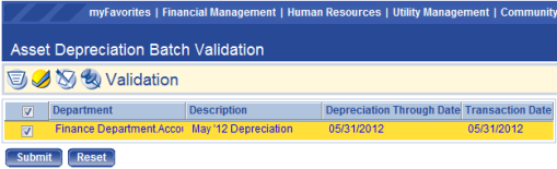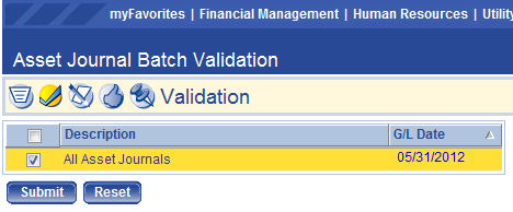 To validate a batch of asset journals, the user must click the Validation icon, then select the check box (es) next to the batch (es) and click Submit.