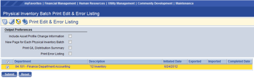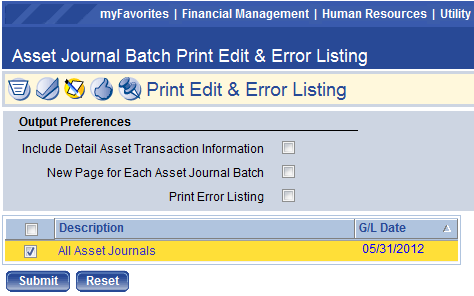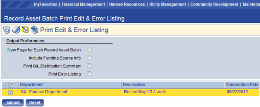 Users have the option of printing an Edit Listing and/or Error Listing. Clicking the Show Preferences link on the right side of the screen (not shown) reveals the Output Preferences shown above. Users can select the preferences which suit their needs, check the batch of assets to show on the report, and then click Submit to generate the report. The report will then be available for viewing in myReports.