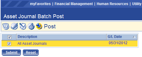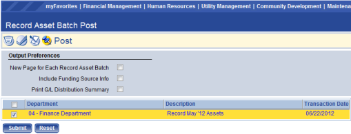 Once the batch has been approved, it will be available for posting. Users can check the batch (es) they wish to post by clicking the check box next to their batch and then Submit. Note there is also a Show Preferences option when posting record asset batches. These options are supplements to the standard post listing and work the same way as the Edit Listing options explained in the step above. Once the batch is posted, a journal will be in the Journal List waiting to be posted to the General Ledger.