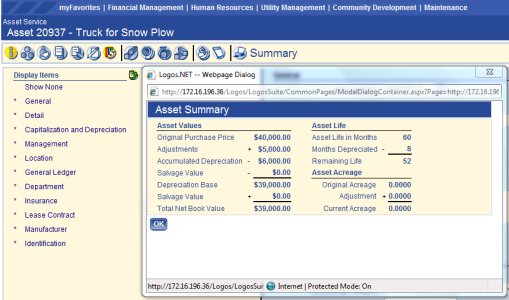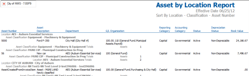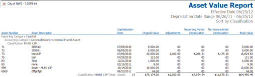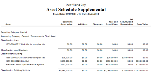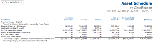 Asset Schedule, Asset Value Schedule and Depreciation can all be obtained using this report. These schedules show additions, disposals, depreciation and ending book value for a user-defined date range. This is a popular report for many organizations’ annual financial reports.