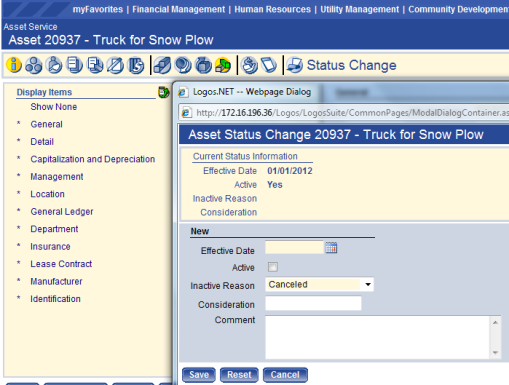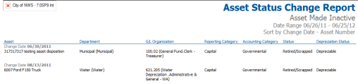 The Asset Status Change Report shows a listing of any assets having a status change within a given date range.