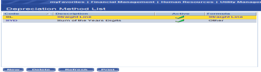 The Depreciation Method List page allows authorized users to view, maintain, and add a list of all asset depreciation methods. The system only calculates depreciation using the straight line method. Depreciation begins the month after the capitalization date (e.g., an asset with a capitalization date of March 15 will begin depreciating in April). Another method can be used, however users will have to calculate the depreciation outside of the system and manually key it into the system.