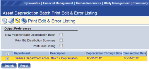 Print Edit or Error listing for the Asset Depreciation process. |