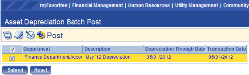 Post button for the Asset Depreciation process. |